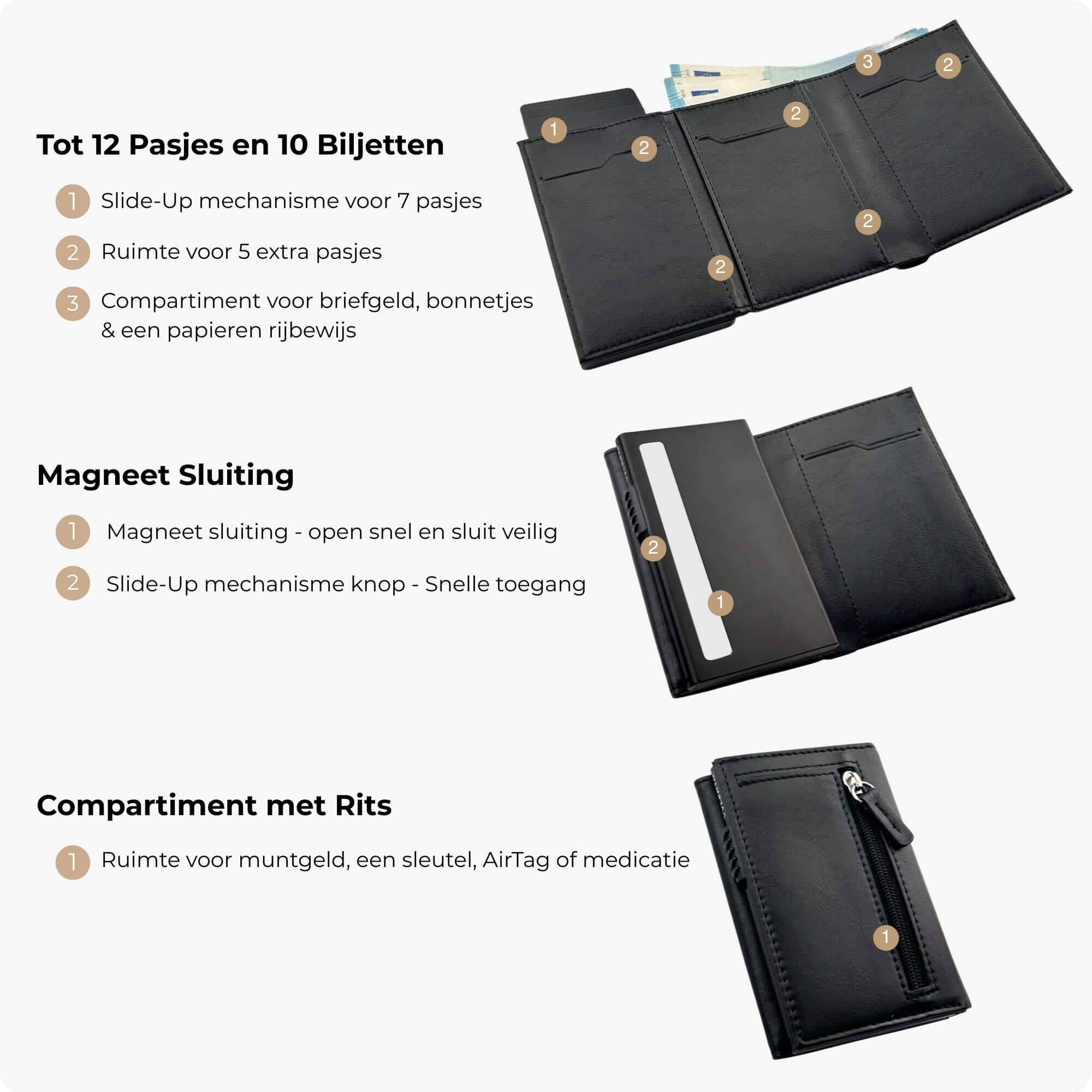 8-10 Notes - The banknote compartment can hold 8-10 notes without folding.