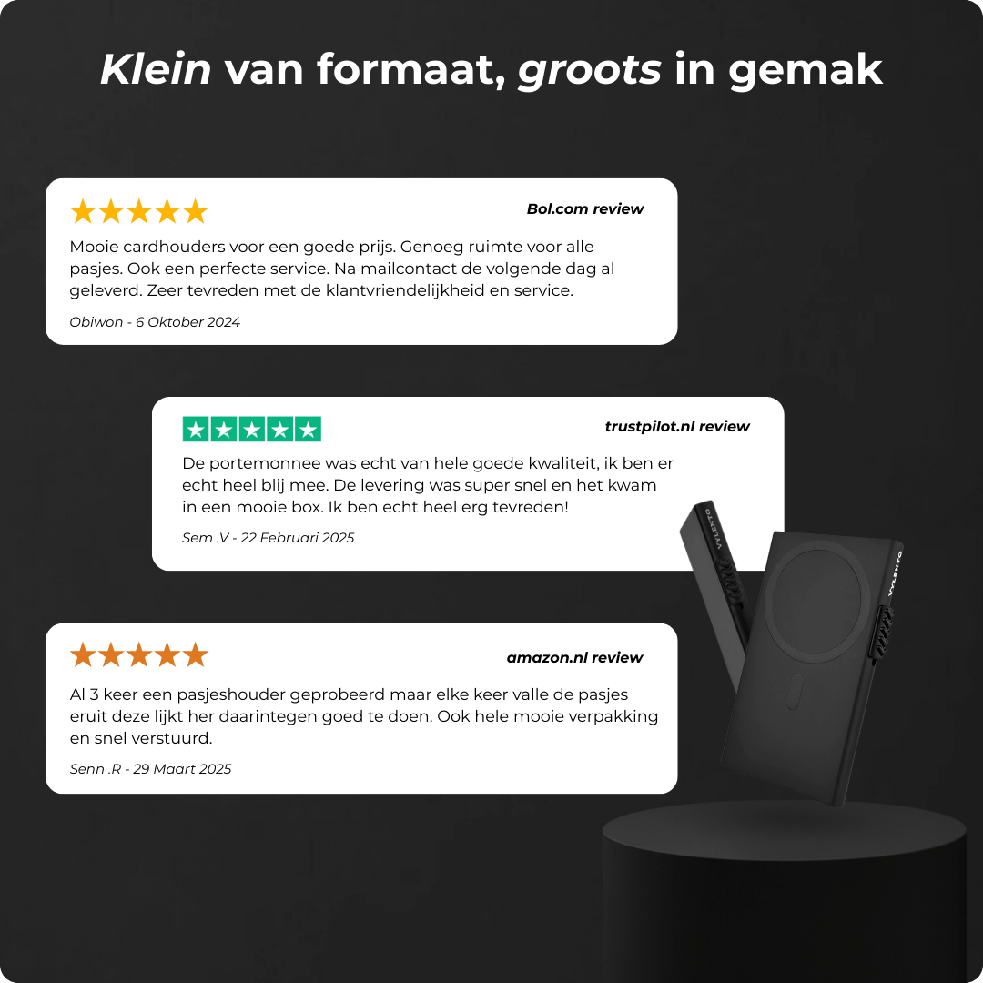 Bij Vylento staat kwaliteit centraal. We kiezen bewust voor hoogwaardige materialen zodat jouw pasjeshouder niet alleen mooi blijft, maar ook lang meegaat. Waar anderen besparen op kwaliteit om een zo laag mogelijke prijs te kunnen bieden, investeren wij juist in kwaliteit waarop je dagelijks kunt vertrouwen. Daarnaast staan we persoonlijk voor je klaar. Geen dagen wachten op antwoord, maar snel en gemakkelijk contact via WhatsApp, e-mail of ons contactformulier.
