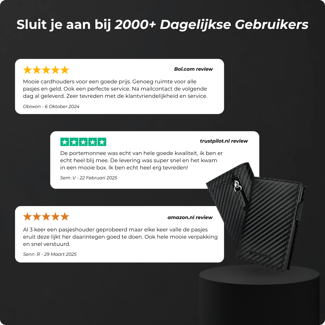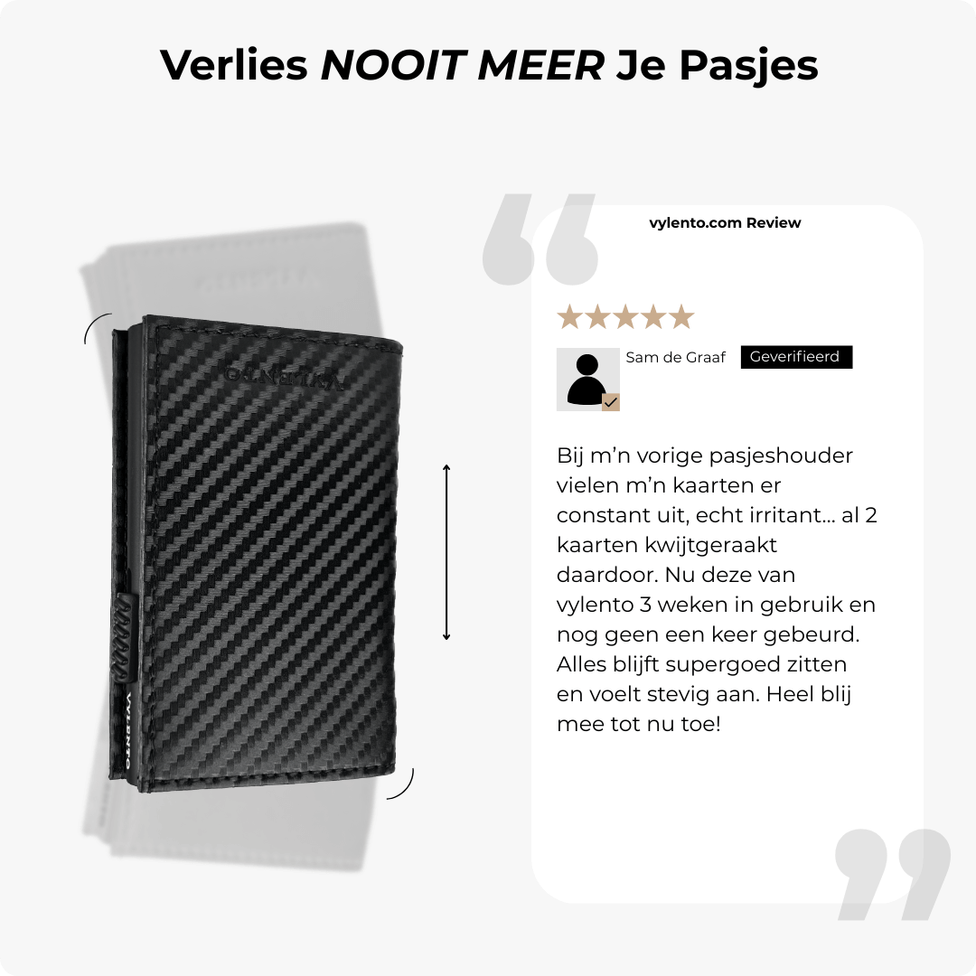 Bij Vylento staat kwaliteit centraal. We kiezen bewust voor hoogwaardige materialen zodat jouw pasjeshouder niet alleen mooi blijft, maar ook lang meegaat. Waar anderen besparen op kwaliteit om een zo laag mogelijke prijs te kunnen bieden, investeren wij juist in kwaliteit waarop je dagelijks kunt vertrouwen. Daarnaast staan we persoonlijk voor je klaar. Geen dagen wachten op antwoord, maar snel en gemakkelijk contact via WhatsApp, e-mail of ons contactformulier.
