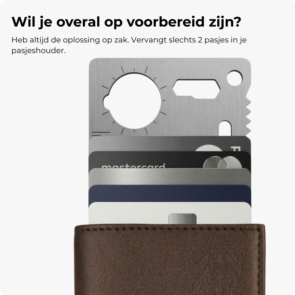 Notitie: De aluminium kaarthouder biedt plek voor 7 pasjes zonder reliëf, of 5 tot 6 pasjes bij een combinatie van standaard pasjes en pasjes met reliëf, zoals creditcards.