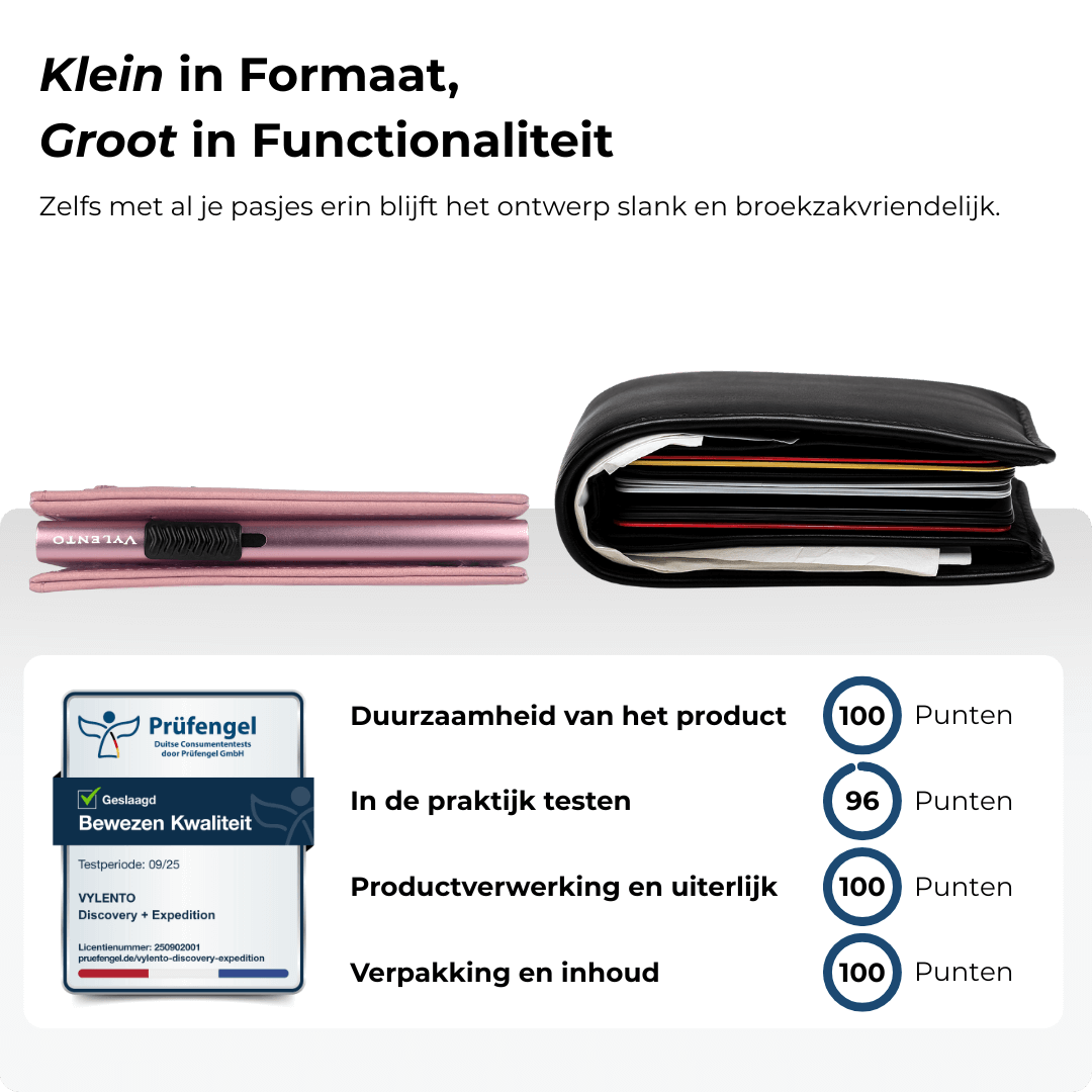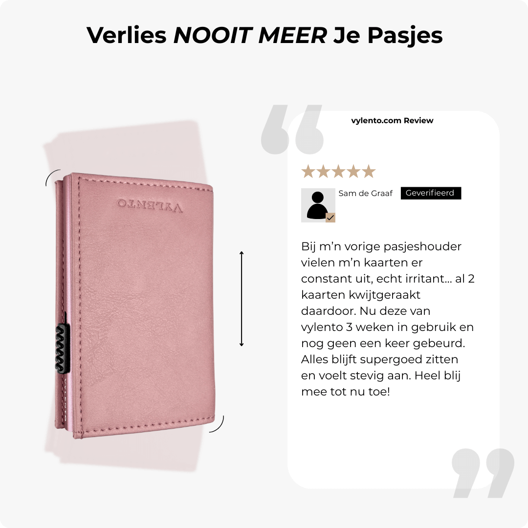 Bij Vylento staat kwaliteit centraal. We kiezen bewust voor hoogwaardige materialen zodat jouw pasjeshouder niet alleen mooi blijft, maar ook lang meegaat. Waar anderen besparen op kwaliteit om een zo laag mogelijke prijs te kunnen bieden, investeren wij juist in kwaliteit waarop je dagelijks kunt vertrouwen. Daarnaast staan we persoonlijk voor je klaar. Geen dagen wachten op antwoord, maar snel en gemakkelijk contact via WhatsApp, e-mail of ons contactformulier.